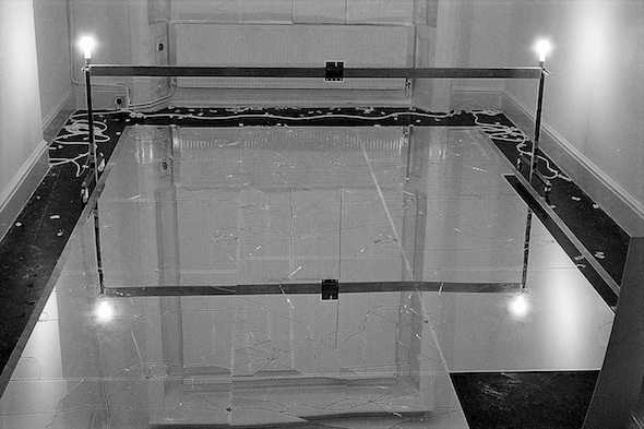 An aerial survey recording the surface of Uli Aigner’s Enemy Contact (2001–2002), after the site-specific installation was removed from the Freud Museum, London. Uli Aigner installed a pavement of mirrors in the lobby of the house where Sigmund Freud spent the last year of his life after his flight from Austria. Visitors to the museum had no choice but to step on the glass and the mirrors became broken. The piece was later removed and installed at the Austrian Cultural Forum London, where it was the site of Anthony Auerbach’s aerial survey