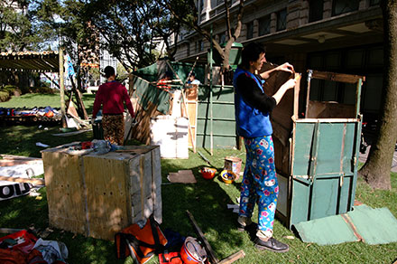 Perhaps the contribution that made the most sense in the biennial was to be found just outside the museum and was the result of a multiplicity of crossed purposes. The chief curator of the biennial seems to have mistaken the four-man artist-group Gelatin for a group of architects (according to her catalogue text). The boys arrived early with tools but without any work to unpack, because they always make their work in situ. Their original project proposal was rejected because of worries it might be exploited by Falun Gong. They needed to buy some materials. The curators promised to mention it at their next committee meeting. Frustration was allowed to come to a head before construction could start. Gelatin's 'Win-Win Project', as it was later entitled, was slum built in the museum garden: an improvised dwelling and outside toilet, made from waste materials from the biennial and odds and ends from the local market. In the end it was the only space in the exhibition where any dialogue took place.